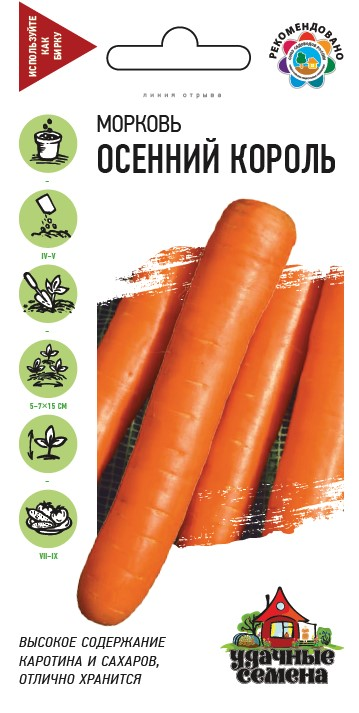 Среднеспелый (период от всходов до уборки урожая 110-115 дней) популярный высокоурожайный сорт. Розетка листьев полураскидистая. Корнеплоды цилиндрической формы (сортотип Нантская), длиной 20-23 см, массой 100-250 г. Мякоть насыщенного оранжевого цвета содержит повышенное количество натурального провитамина А (каротина) и полезных сахаров. Хорошо хранится, сохраняет питательную ценность вплоть до нового урожая и помогает восполнить недостаток витаминов в течение всей зимы. Урожайность 2,5-5,0 кг/м². Рекомендован для употребления в свежем виде, консервирования и зимнего хранения. Посев семян в грунт производится в конце апреля – начале мая на глубину 1 см, расстояние между рядками 15 см. Подросшие всходы прореживают, оставляя между растениями по 5-7 см.