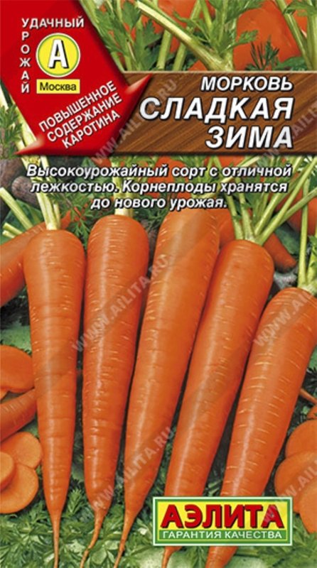 Высокоурожайный, позднеспелый сорт (период от полных всходов до технической спелости 140-150 дней). Один из самых лучших сортов с повышенным содержанием каротина и сахаров, незаменим в диетическом и детском питании. Корнеплоды конические (сортотип Флакке), длиной до 30 см, крупные, ярко-оранжевые. Мякоть сочная, нежная, сладкая. Отличная лежкость, сохраняет питательную ценность вплоть до нового урожая. Урожайность – 7-8 кг/м2.